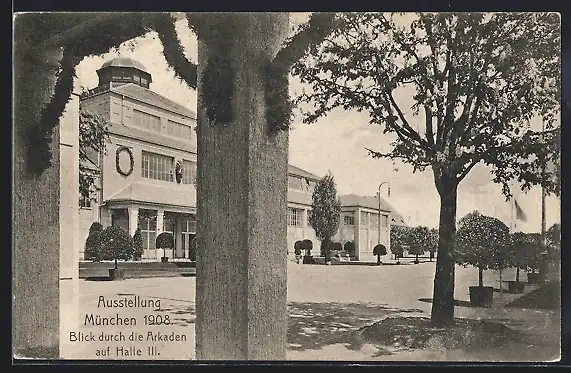 AK München, Ausstellung 1908, Blick durch Arkaden auf Halle III
