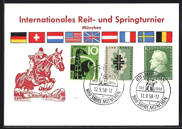 AK München, Internationales Reit- u. Springturmier, Reiter beim Sprung, Internationale Flaggen