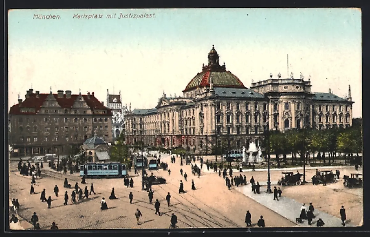 AK München, Karlsplatz mit Justizpalast und Strassenbahn