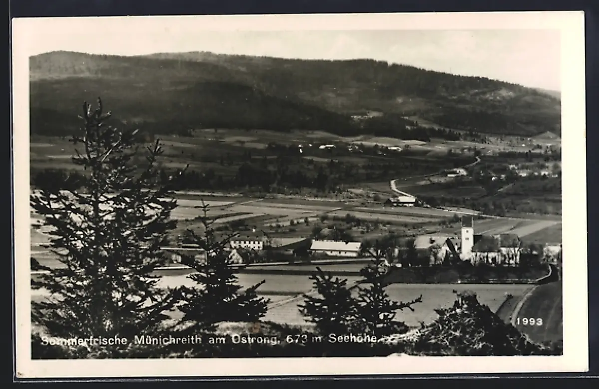 AK Münichreith am Ostrong, Ortsansicht mit Bergmassiv