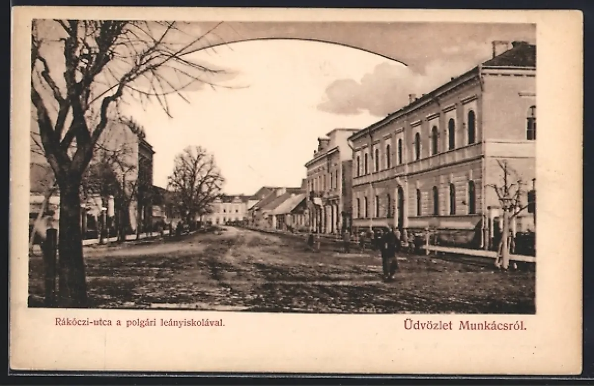 AK Munkács, Rákóczi-utca a polgári leányiskolával