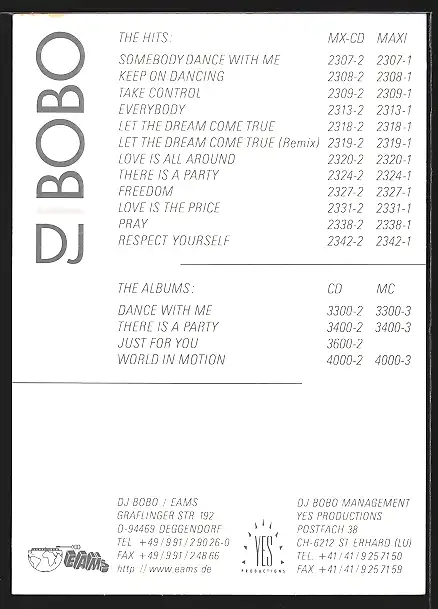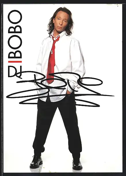 AK Musiker DJ Bobo mit langem Haar in weissem Hemd mit roter Krawatte, mit Autograph