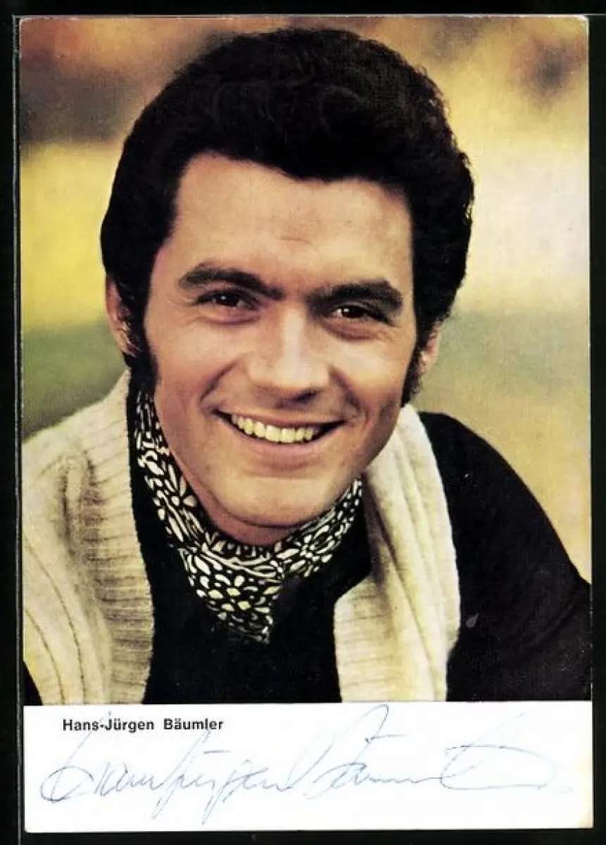AK Musiker Hans-Jürgen Bäumler blickt lächelnd in die Kamera, Autograph