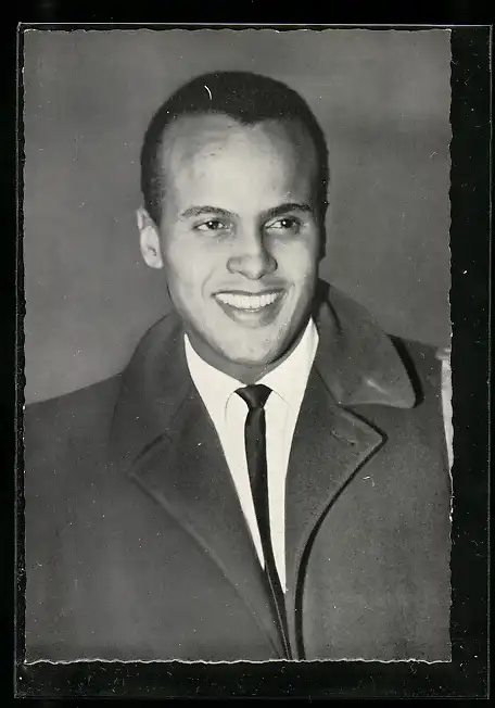 AK Musiker Harry Belafonte lächelnd in Mantel mit Krawatte