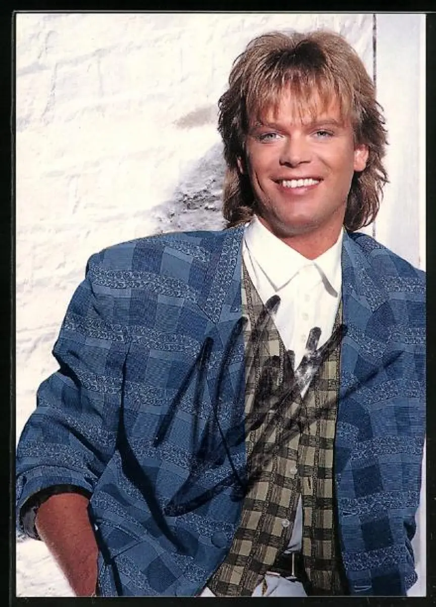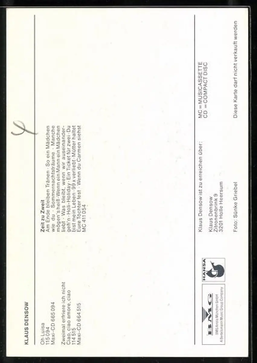 AK Musiker Klaus Densow vor einer weissen Mauer, Autograph
