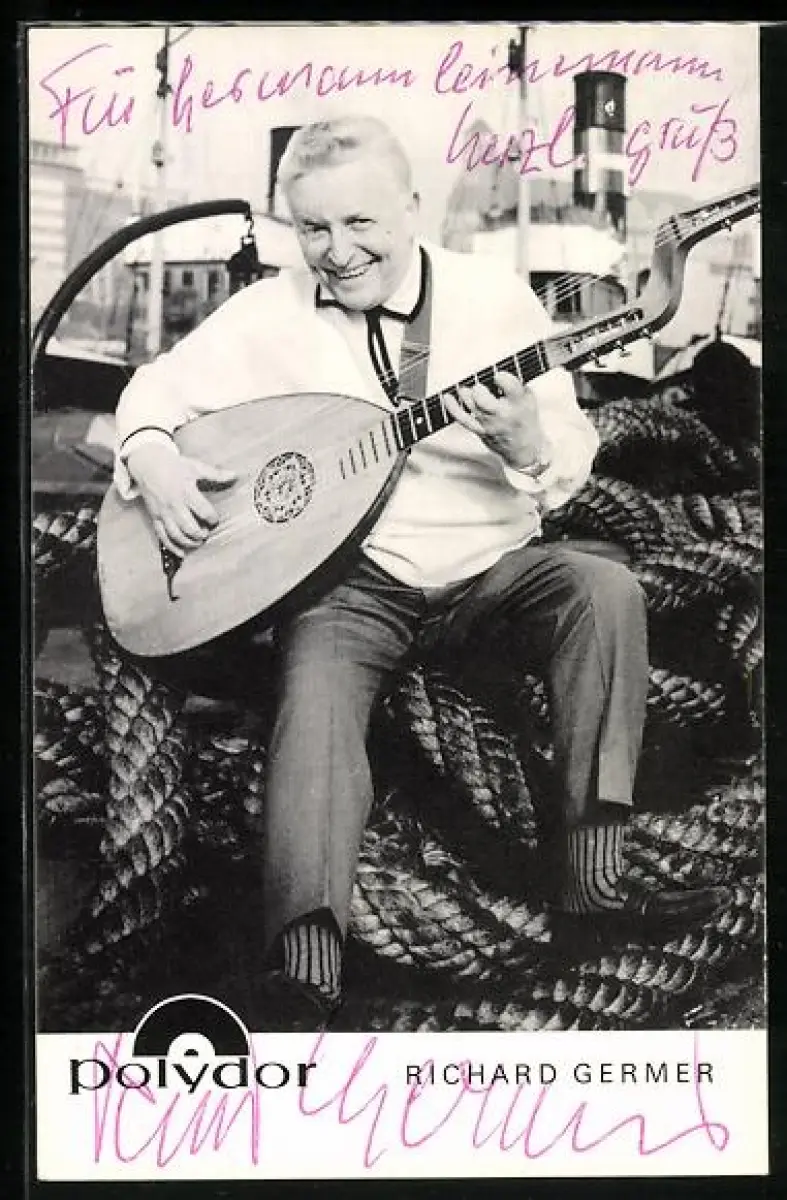 AK Musiker Richard Germer mit Saiteninstrument im Hafen, Autograph