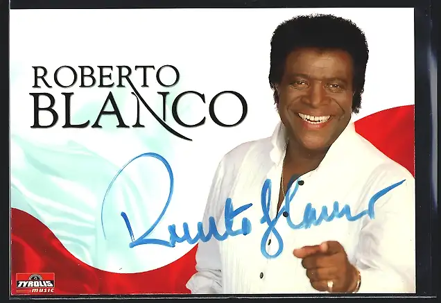 AK Musiker Roberto Blanco mit breitem Lächeln und Fingerzeig, mit Autograph