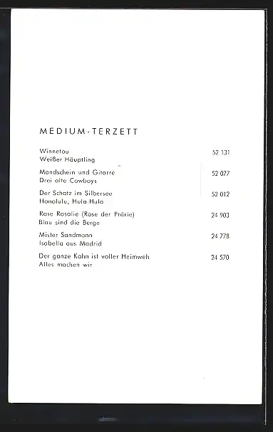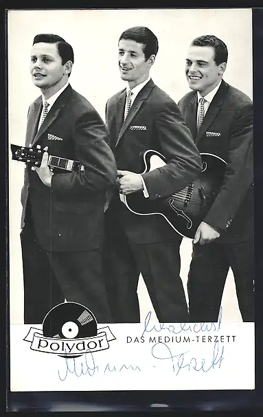 AK Musiker der Band Das Medium-Terzett in Anzügen mit einer Gitarre, mit Autograph