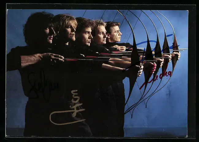 AK Musiker der Band Münchener Freiheit mit Pfeil und Bogen, Autogramme