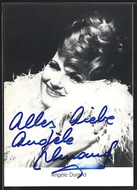 AK Musikerin Angéle Durand lächelnd mit einer Feder-Boa, mit Autograph
