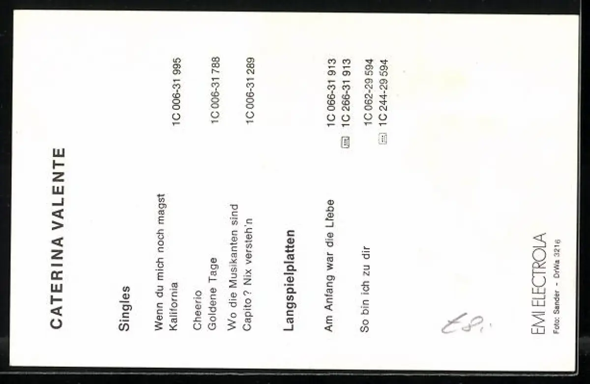 AK Musikerin Caterina Valente in weissem Kleid, Autograph