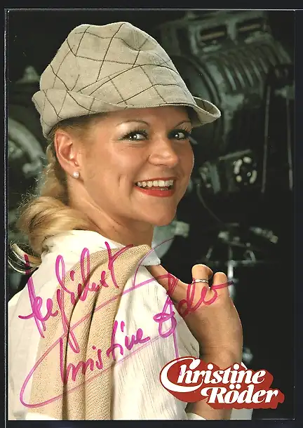 AK Musikerin Christine Röder breit lächelnd mit eniem Hut und der Strickjacke über der Schulter, mit Autograph