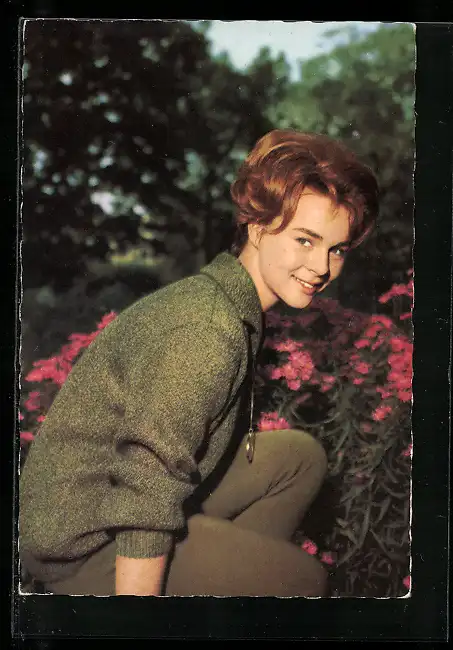 AK Musikerin Conny Froboess hockend in die Kamera schauend