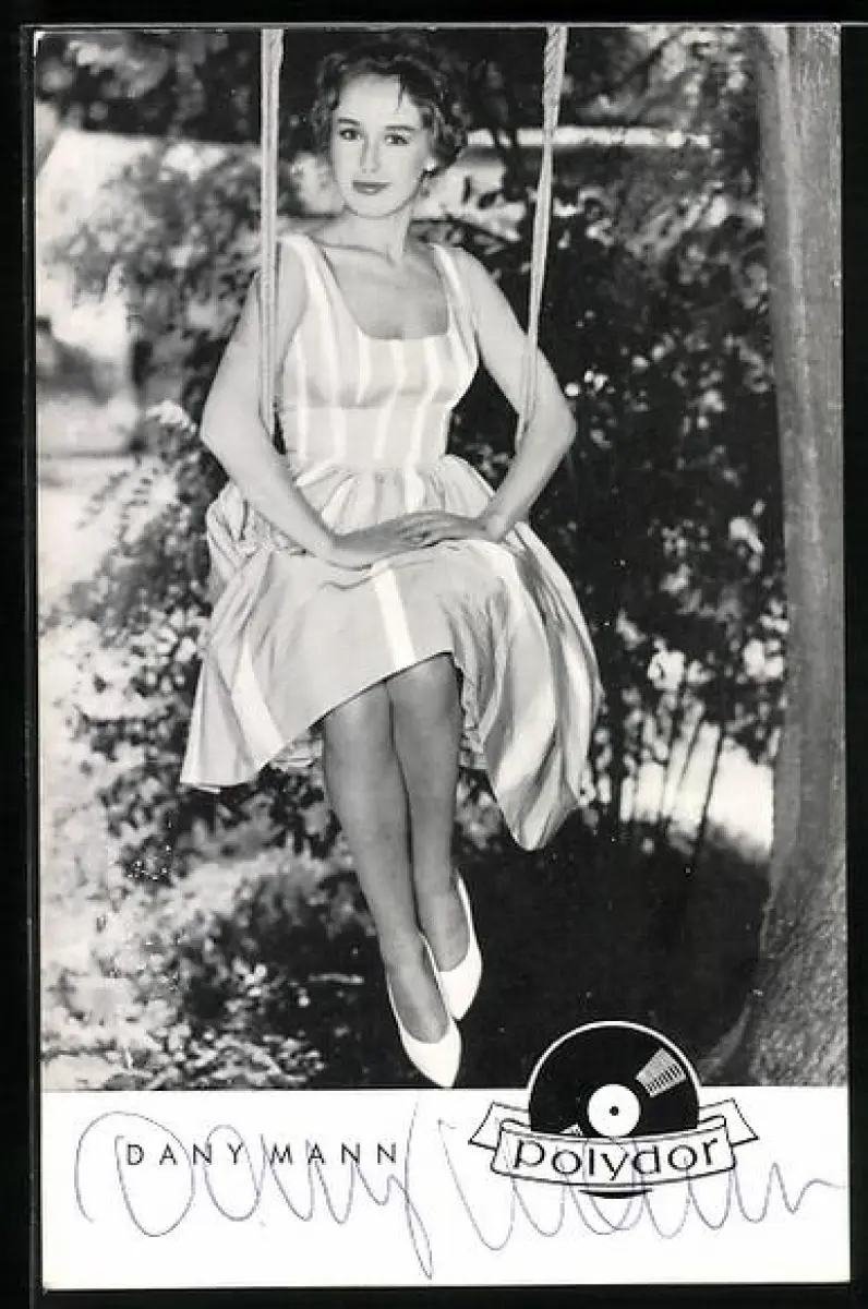 AK Musikerin Dany Mann auf einer Schaukel sitzend, Autograph