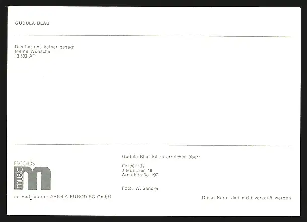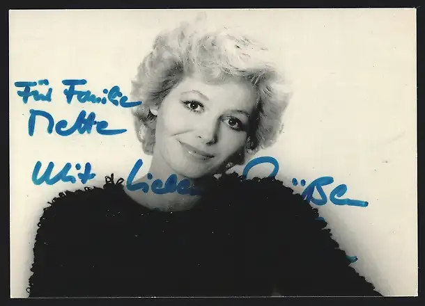 AK Musikerin Gudula Blau mit kurzem, lockigen Haar und Lächeln, mit Autograph