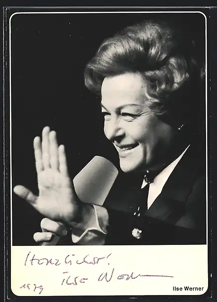 AK Musikerin Ilse Werner mit Mikrofon grüsst das Publikum, mit Autograph