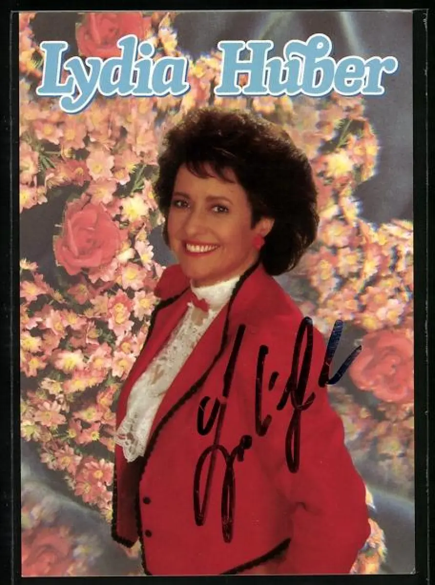 AK Musikerin Lydia Huber lächelt strahlend, Autograph