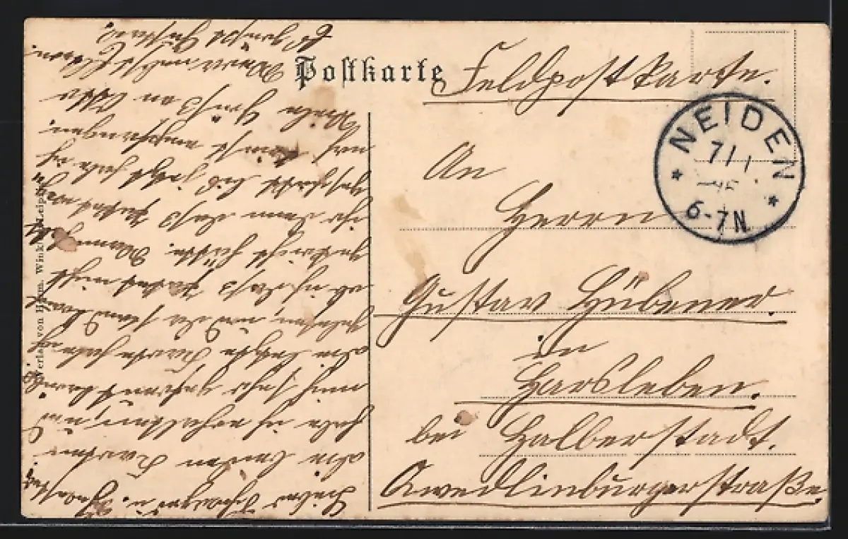 Personenbezogene Daten auf der Rückseite der Karte wurden durch blauen Textmarker unkenntlich gemacht. Die blauen Stellen sind auf die Vorderseite durchgeweicht und wirken sich negativ auf das Postkartenfoto aus