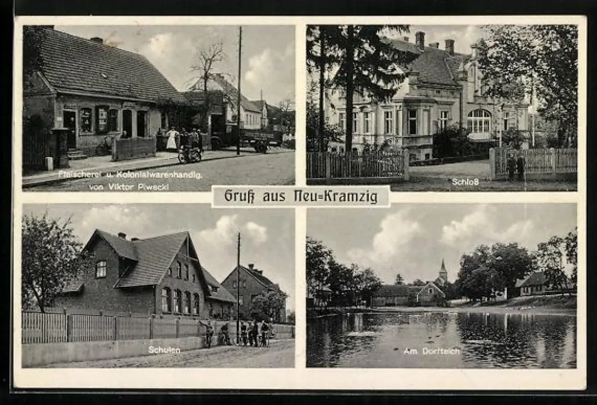 AK Neu-Kramzig, Fleischerei und Kolonialwarenhandlg. von Viktor Piwecki, Schulen, Am Dorfteich