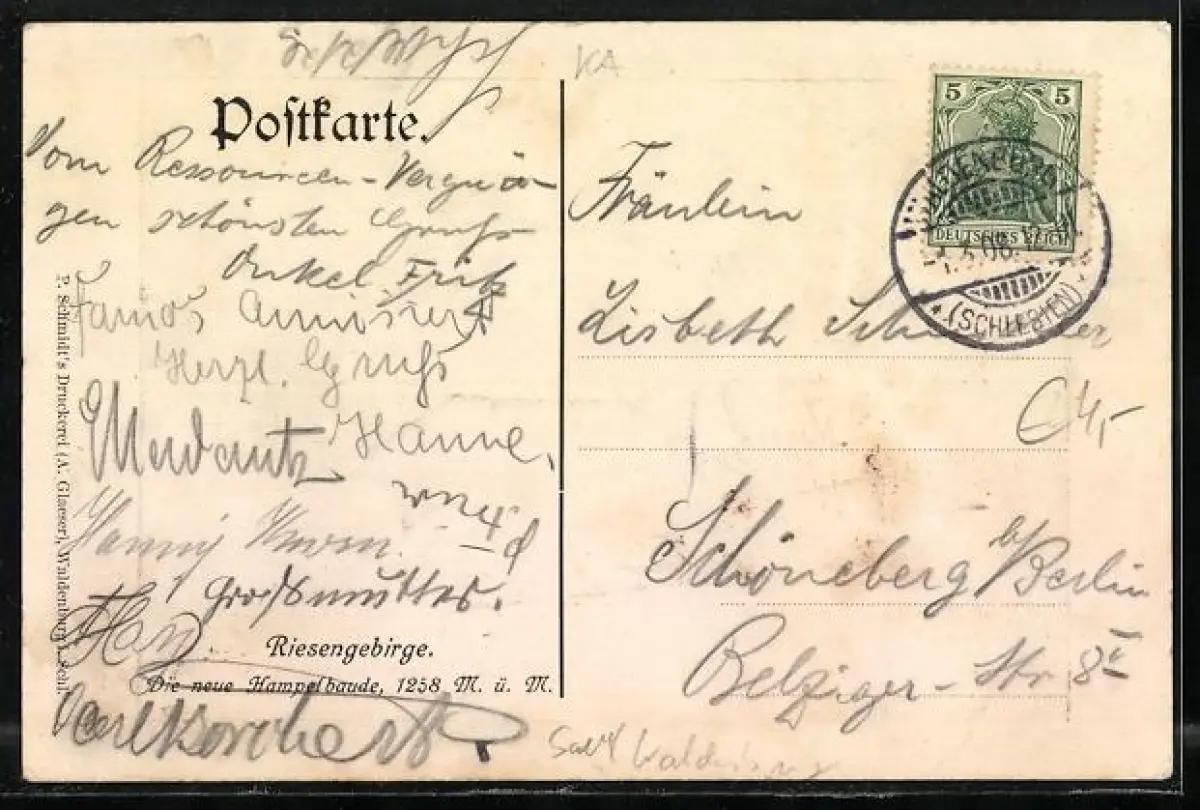 Personenbezogene Daten auf der Rückseite der Karte wurden durch blauen Textmarker unkenntlich gemacht. Die blauen Stellen sind auf die Vorderseite durchgeweicht und wirken sich negativ auf das Postkartenfoto aus