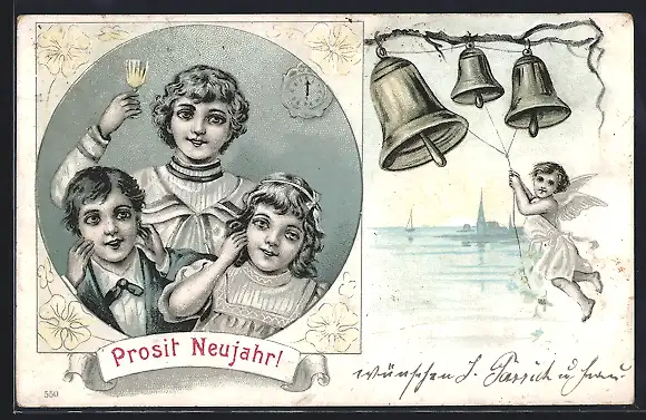 AK Neujahrsengel läutet Glocken, Kinder mit Sektglas, Neujahrsgruss