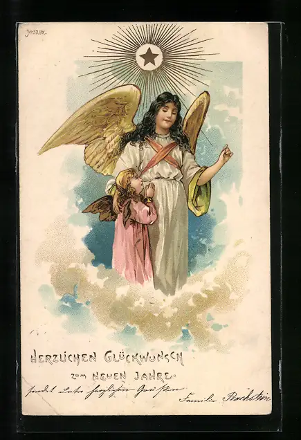 AK Neujahrsengel mit kleinen Engelchen unter einem strahlenden Stern, Neujahreswünsche