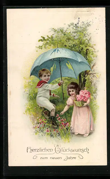 AK Neujahrsgruss, Zwei Kinder pflücken Blumen auf einer Wiese
