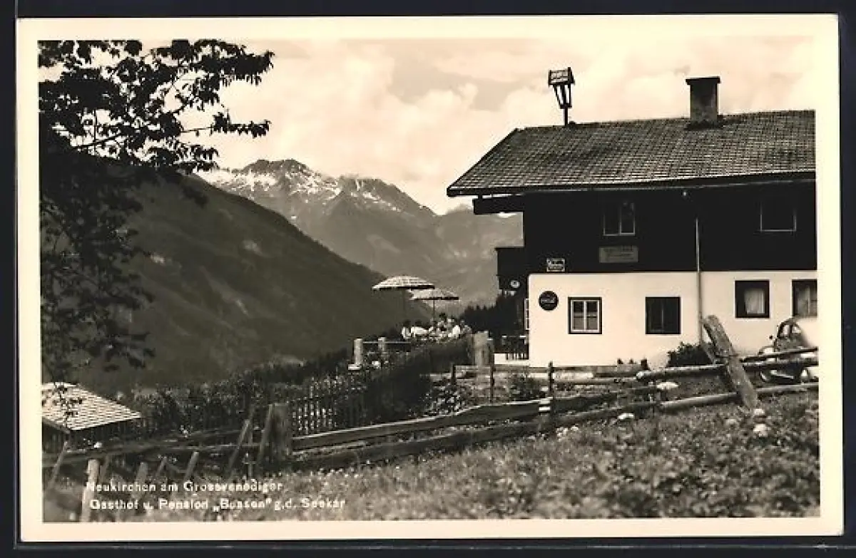 AK Neukirchen am Grossvenediger, Gasthof-Pension Buasen gegen Seekar, mit Gästen auf der Terrasse
