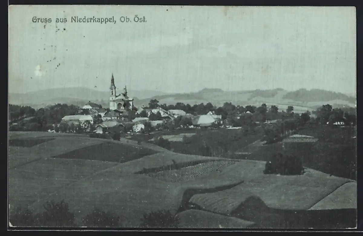 AK Niederkappel /Ob. Öst., Ortsansicht und Felder aus der Vogelschau