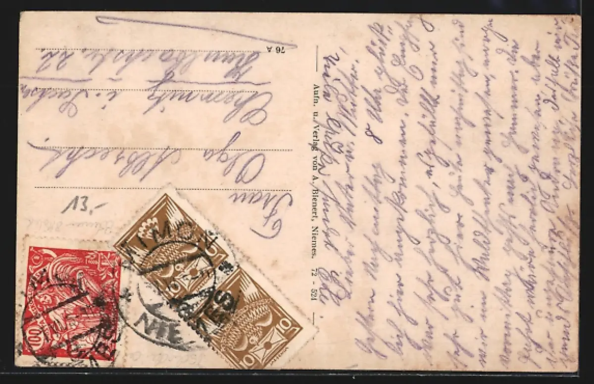 Personenbezogene Daten auf der Rückseite der Karte wurden durch blauen Textmarker unkenntlich gemacht. Die blauen Stellen sind auf die Vorderseite durchgeweicht und wirken sich negativ auf das Postkartenfoto aus