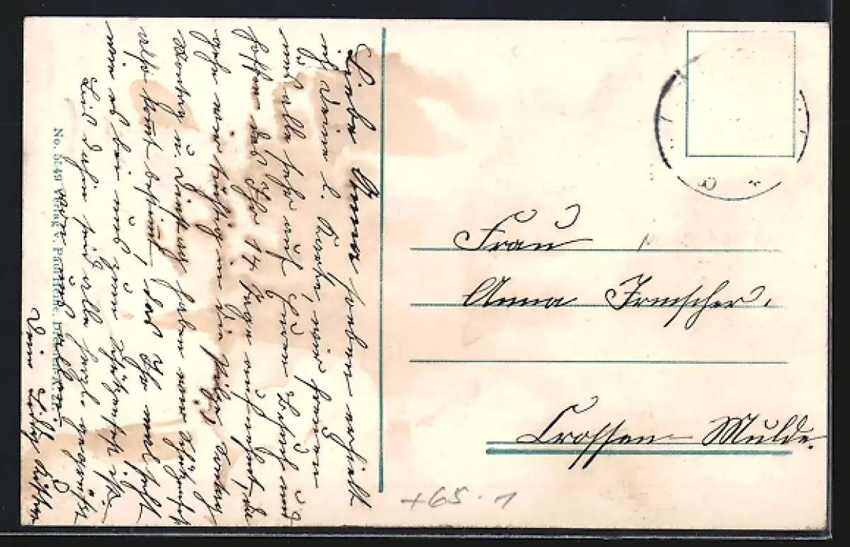 Personenbezogene Daten auf der Rückseite der Karte wurden durch blauen Textmarker unkenntlich gemacht. Die blauen Stellen sind auf die Vorderseite durchgeweicht und wirken sich negativ auf das Postkartenfoto aus