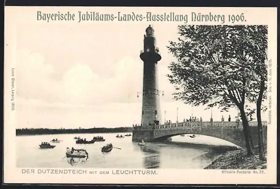 AK Nürnberg, Bayerische Jubiläums-Landes-Ausstellung 1906, Der Dutzendteich mit dem Leuchtturm