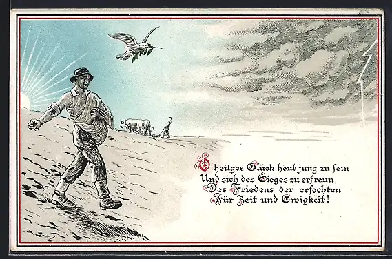 AK O heiliges Glück heut jung zu sein, Feldarbeiter und Friedenstaube