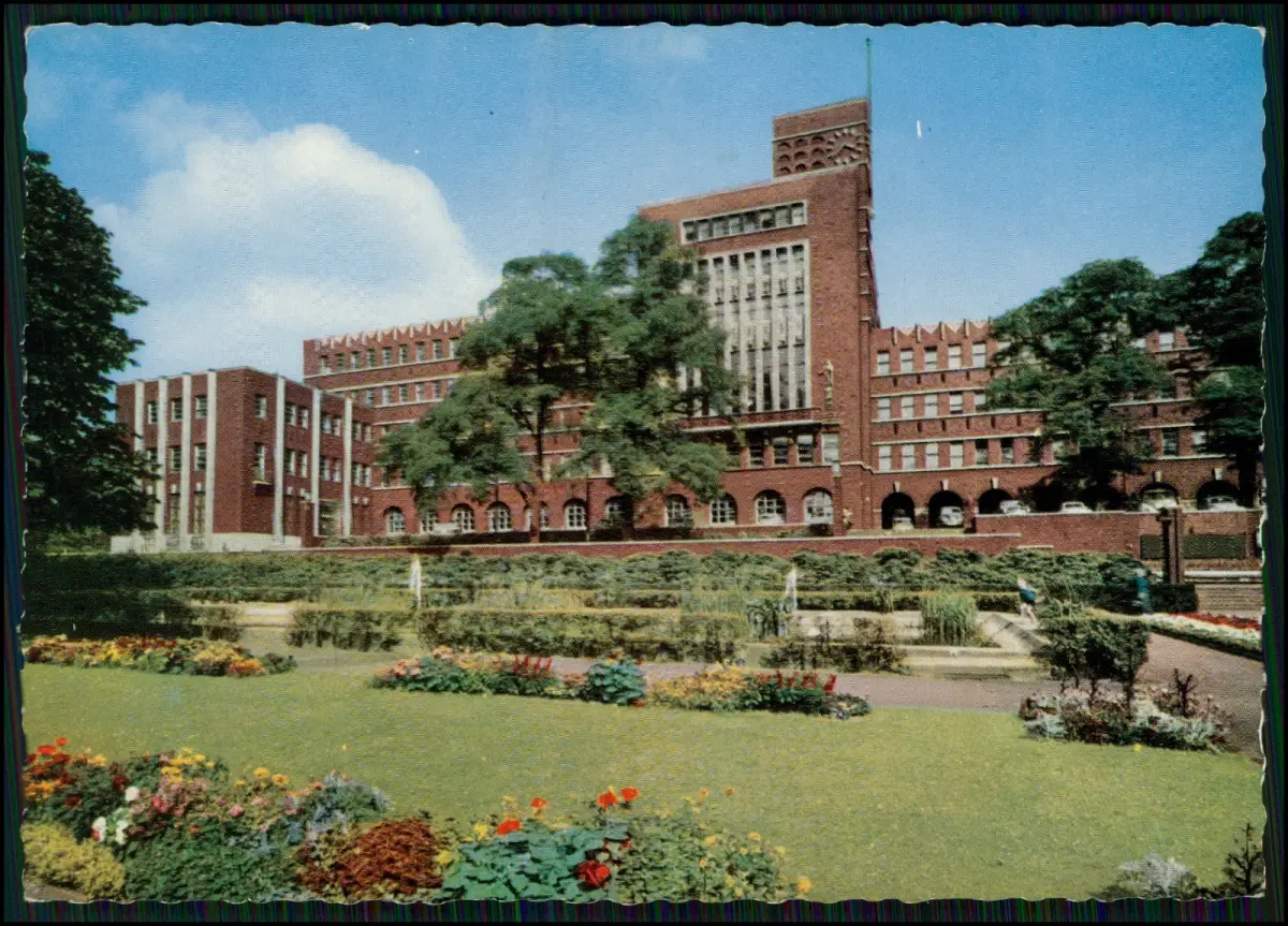 Oberhausen im Rheinland, hier mit einer farbigen Postkarte des imposanten Rathauses im Stil der modernen Backsteinarchitektur – kombiniert mit dem Grillopark, einer sorgfältig gestalteten Gartenanlage mit Blumenrabatten, Brunnen und Spazierwegen.