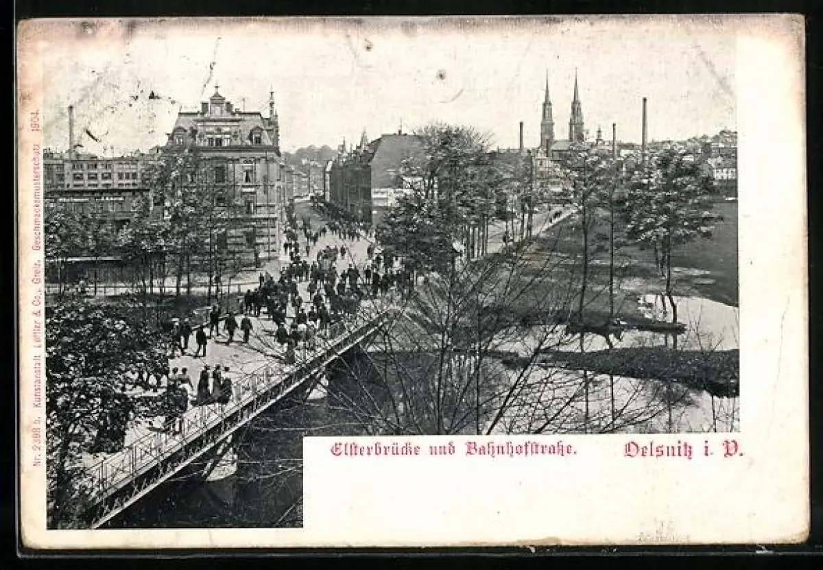 AK Oelsnitz i. V., Elsterbrücke und Bahnhofstrasse mit Ortsansicht aus der Vogelschau