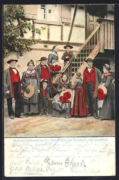 AK Ooedsbach, Renchthäler in badischen Volkstrachten vor einem Fachwerkhaus stehend