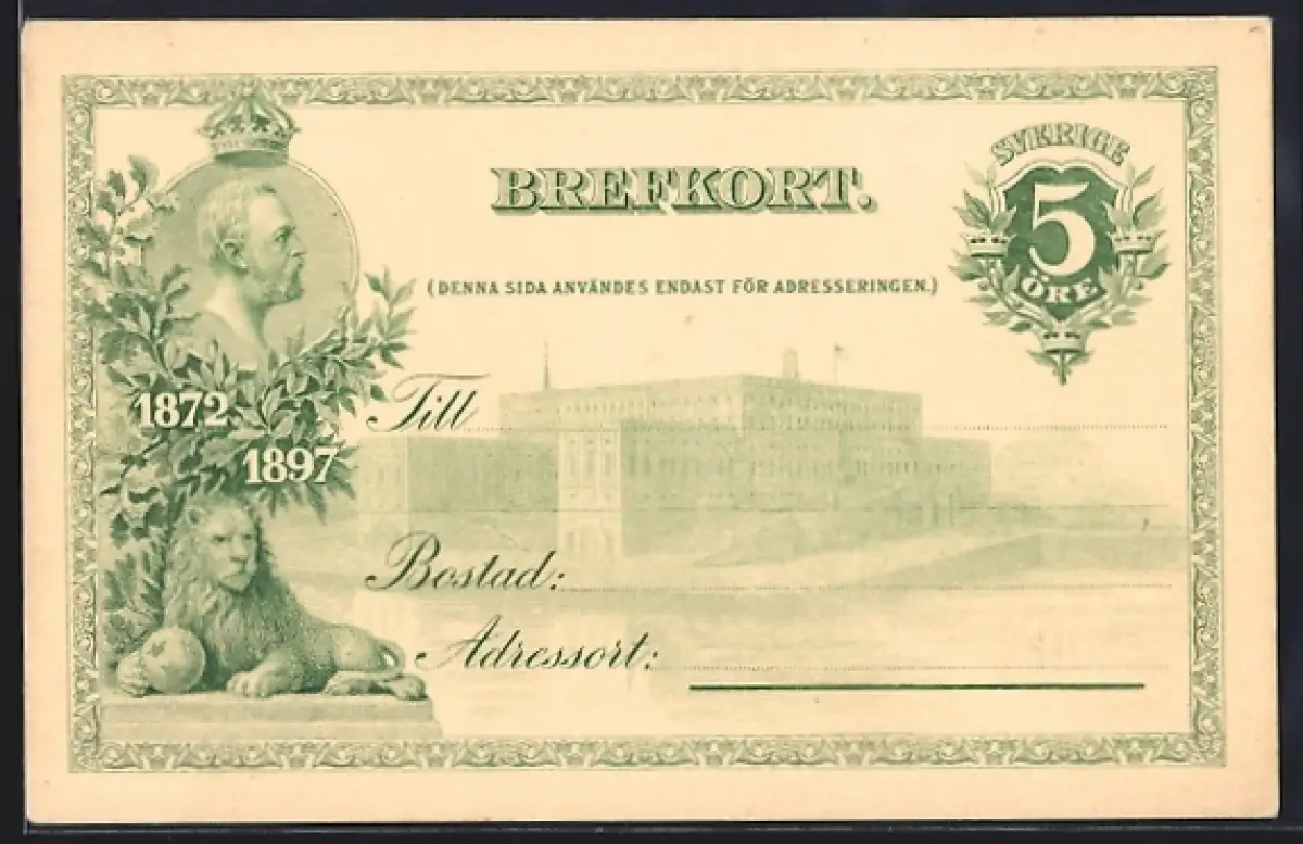 AK Oskar II. von Schweden Portrait, Gebäudeansicht und Löwenstatue