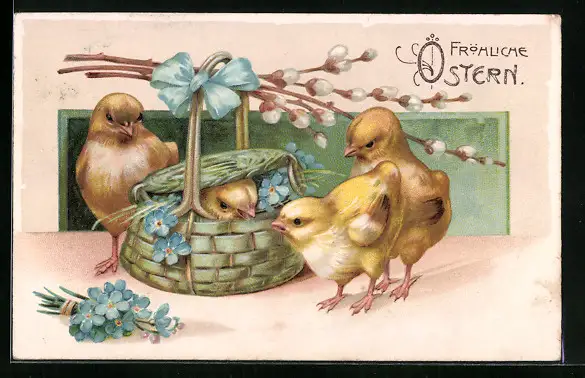 AK Osterküken mit Körbchen voller Vergissmeinnicht