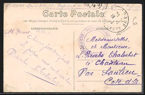 Personenbezogene Daten auf der Rückseite der Karte wurden durch blauen Textmarker unkenntlich gemacht. Die blauen Stellen sind auf die Vorderseite durchgeweicht und wirken sich negativ auf das Postkartenfoto aus