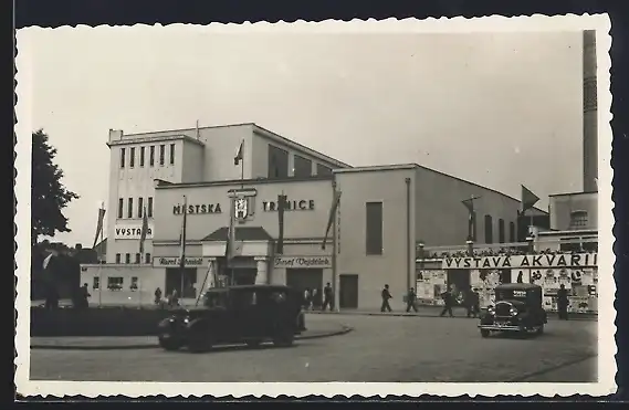 AK Pardubice, Vystava Akvarii, Ausstellungsgebäude mit Strasse u. Autos