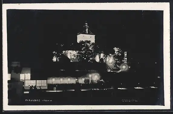 AK Pardubice, Výstava, Ausstellungsgebäude bei Nacht
