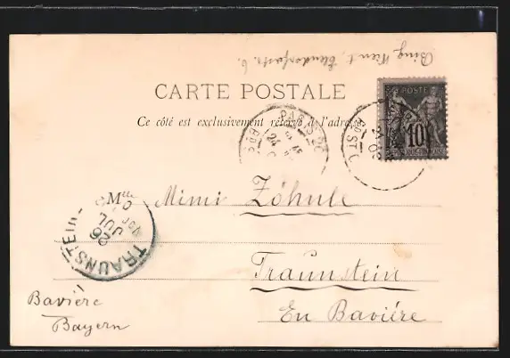 Personenbezogene Daten auf der Rückseite der Karte wurden durch blauen Textmarker unkenntlich gemacht. Die blauen Stellen sind auf die Vorderseite durchgeweicht und wirken sich negativ auf das Postkartenfoto aus