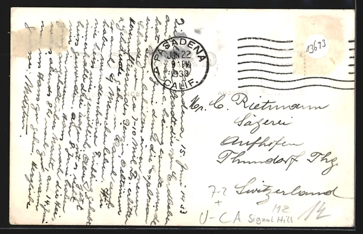 Personenbezogene Daten auf der Rückseite der Karte wurden durch blauen Textmarker unkenntlich gemacht. Die blauen Stellen sind auf die Vorderseite durchgeweicht und wirken sich negativ auf das Postkartenfoto aus