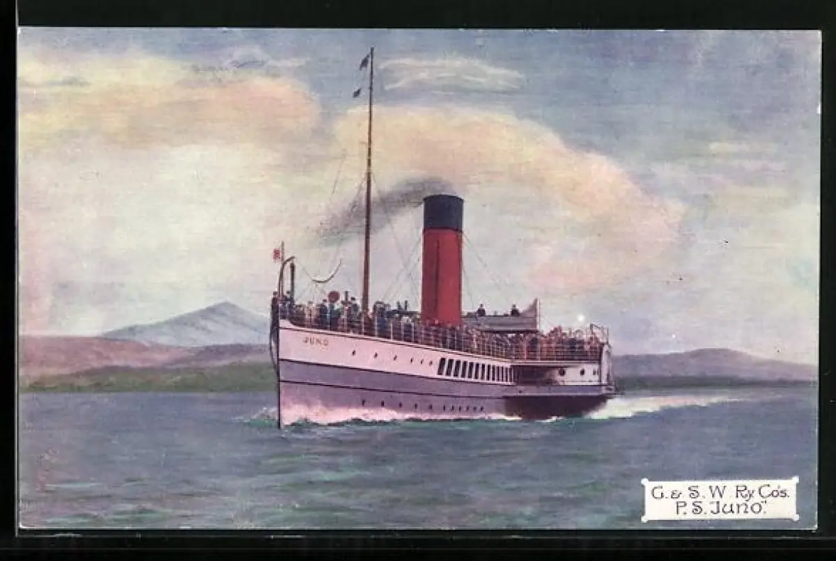 AK Passagierschiff P.S. Juno fährt eine Küste entlang, G. & S.W.Ry. Co`s