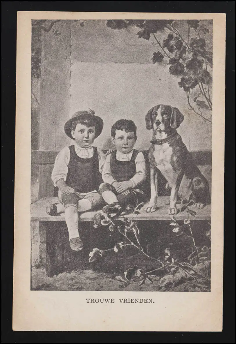AK Pays-Bas "Trouwe Vrienden" 2 garçons avec chien sur un banc, non utilisé