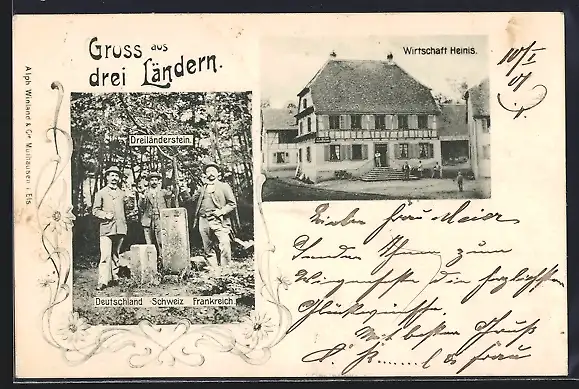 AK Pfefferhausen, Gasthaus Heinis, Dreiländerstein an der Grenze Deutschland-Schweiz-Frankreich