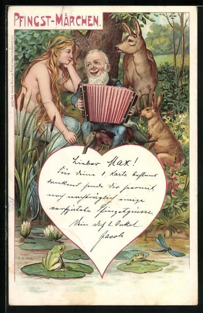 AK Pfingst-Märchen, Zwerg mit Akkordion, Nixe, Reh und Hase am Froschteich