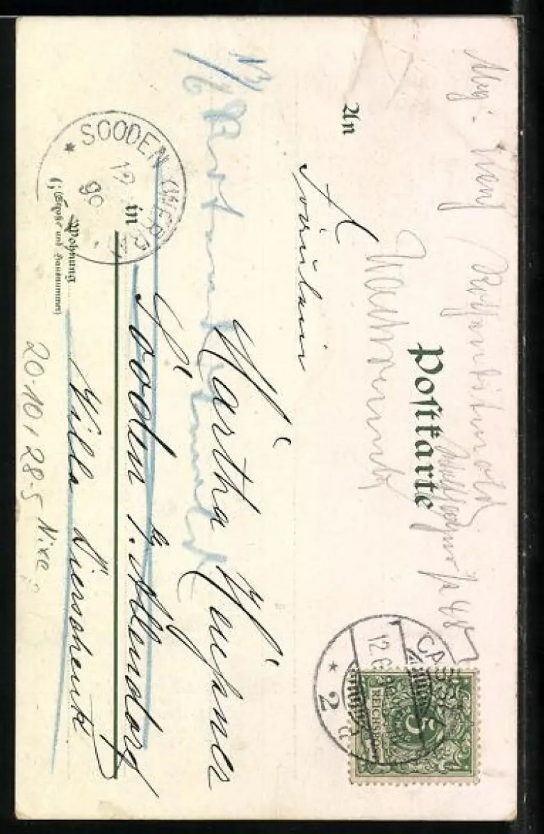 Personenbezogene Daten auf der Rückseite der Karte wurden durch blauen Textmarker unkenntlich gemacht. Die blauen Stellen sind auf die Vorderseite durchgeweicht und wirken sich negativ auf das Postkartenfoto aus