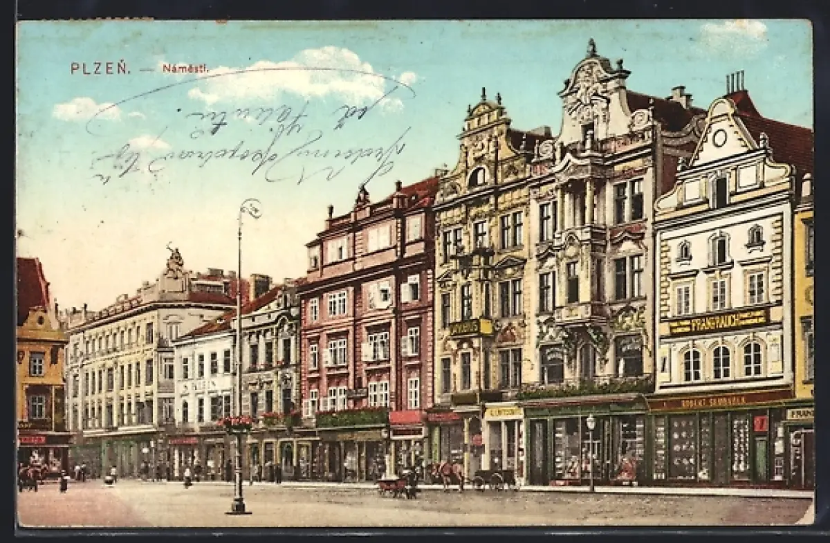 AK Pilsen, Stadtplatz mit Geschäften, Fuhrwerke