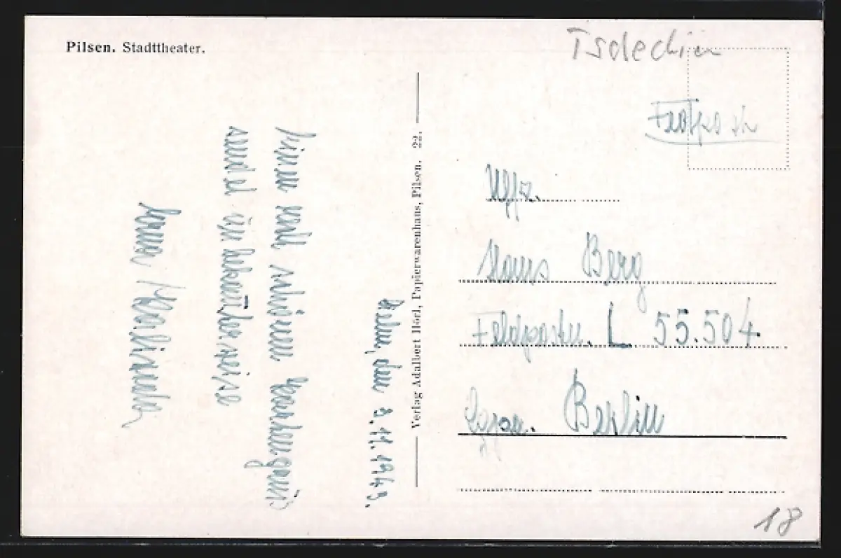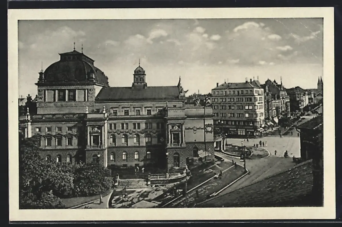 AK Pilsen, Stadttheater mit Umgebung aus der Vogelschau